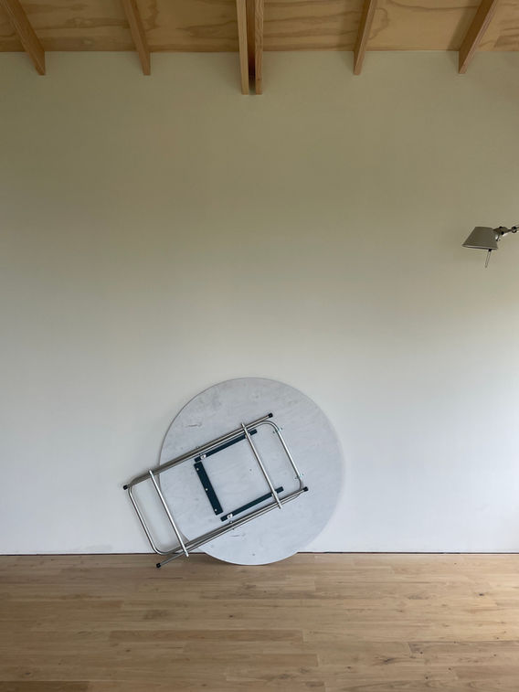 Two bended tubes in stainless steel are attached in the middle with nuts and bolts and forms a foldable base. The multiplex top is light and stable and treated with a water-based paint
