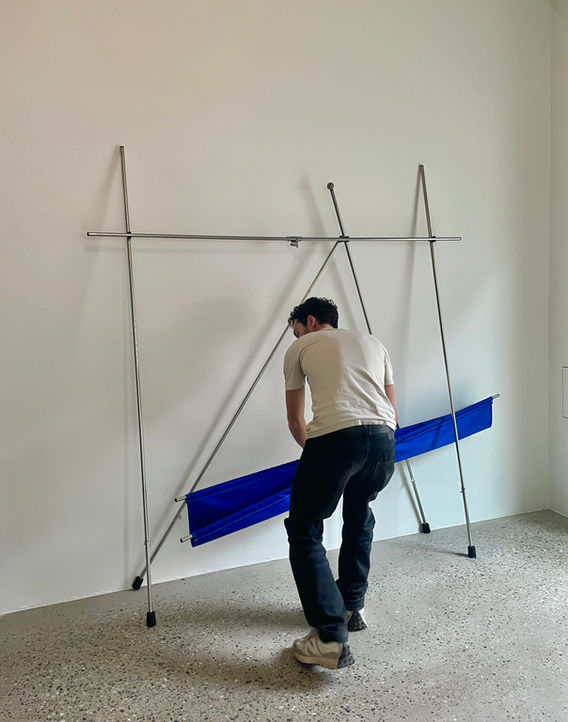 This is the result of a playfull moment with some stainless steel tube leftovers. All the elements can be clicked into each other, than put against the wall. There's no screw machine involved.